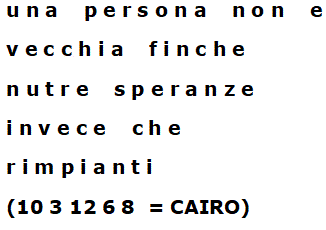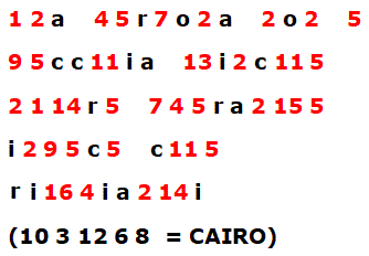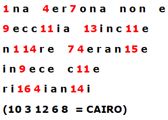 Sostituendo i numeri con le corrispondenti lettere di cairo si ottiene: