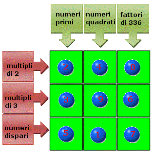Solo il 2 è un numero primo e solo il 4 è un numero quadrato e quindi il 2 va messo nella prima riga nella colonna