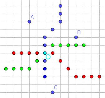 Questi tre luoghi di punti si intersecano nello stesso punto O che dista 6 isolati da A, B e C e quindi è il luogo dove si desidera costruire la