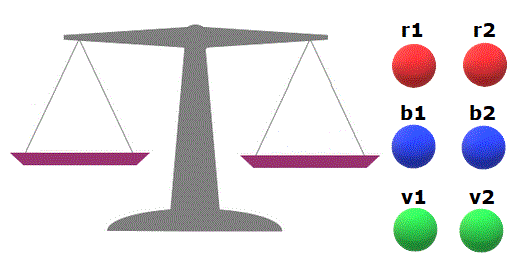 Quesito n° 13: Si hanno 3 coppie di palline 2 rosse, 2 blu, 2 verdi tutte con le stesse dimensioni. In ogni coppia una pallina è leggermente più pesante, inoltre le tre palline più pesanti hanno lo stesso peso e anche quelle più leggere hanno lo stesso peso. Con una bilancia a due piatti e con solo due pesate com'è possibile individuare le tre palline più pesanti?
