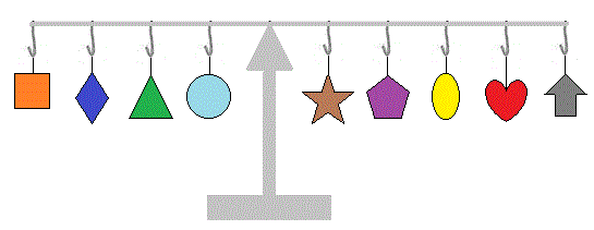 Quesito n° 18: Assegna ad ogni peso in figura un valore da 1 a 9, ciascuno preso una sola volta, in modo che la bilancia sia in equilibrio.