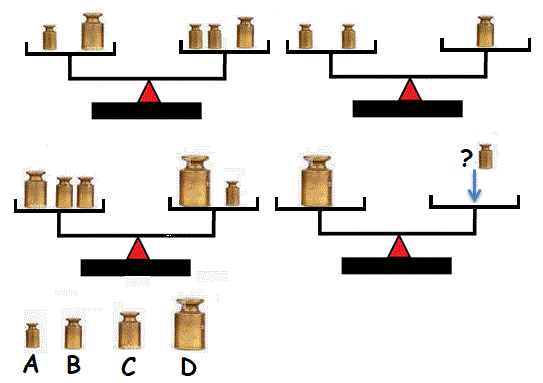 Quesito n° 23: Osservando le prime tre pesate stabilisci: quanti pesi A occorrono per equilibrare il peso D nella quarta pesata?