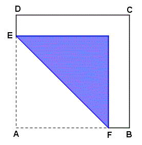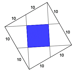 Quesito n° 27: Un foglio di carta quadrato di lato 10 viene piegato, come si vede in figura, in modo che la parte bianca (un esagono concavo) e la parte blu (un triangolo rettangolo isoscele) abbiano la stessa area. Quanto misura il lato del triangolo rettangolo isoscele?