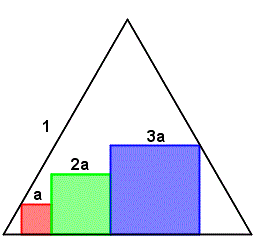 Quesito n° 28: Tre quadrati di lati rispettivamente a, 2a, 3a sono interni a un triangolo equilatero di lato 1 come si vede in figura. Qual è la misura di a?
