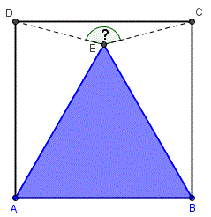 Quesito n° 36: Sul lato AB del quadrato ABCD è stato costruito il triangolo equilatero ABE come si vede in figura. Qual è l'ampiezza dell'angolo CED?
