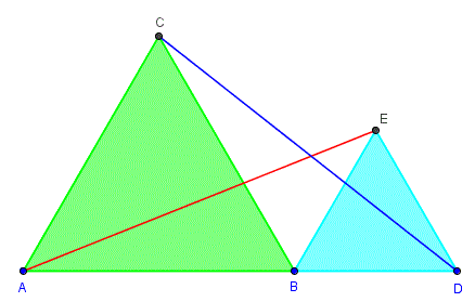 Quesito n° 38: Sapendo che i due triangoli equilateri in figura non hanno la stessa dimensione e che le basi sono collineari, i segmenti AE e CD hanno la stessa lunghezza?
