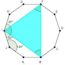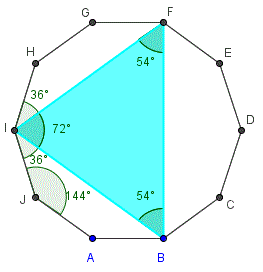 Gli angoli AJI e JIB sono supplementari e sono supplementari anche gli angoli GHI e HIF. L'angolo AJI è un angolo interno del decagono regolare e quindi
