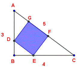 Quesito n° 7: Nel triangolo rettangolo con i lati 3, 4, 5 è inscritto un quadrato con un lato sull'ipotenusa. Qual è l'area del quadrato?
