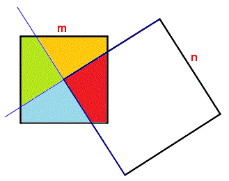 Prolungando due lati del quadrato di lato n, il quadrato di lato m risulta suddiviso in quattro parti uguali ciascuna avente area m2/4.