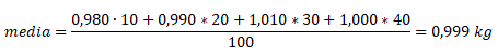 Non avendo il numero del campione preso in esame si considera che esso sia 100 e le percentuali siano le frequenze e il peso medio delle confezioni si ottiene applicando la media ponderale: Pertanto la media delle confezioni di zucchero è 0,999 kg