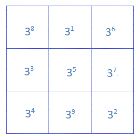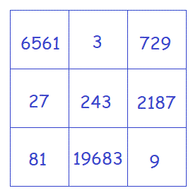 Se si scompone ciascun termine della progressione geometrica come potenza di 3 risulta poi più semplice disporre ciascun numero nel proprio quadratino perchè in questo modo il prodotto su ogni riga, colonna o diagonale sarà sempre 315