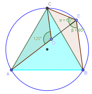sulla stessa corda AB. Quindi gli angoli CEA e AEB sono entrambi di 60° e l'angolo CEB è di 120°.