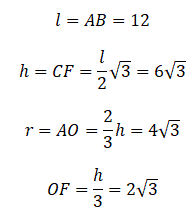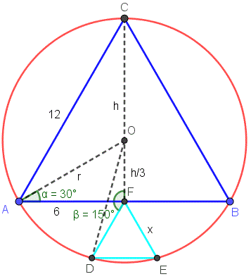 Conoscendo il lato AB del triangolo equilatero ABC possiamo determinare l'altezza CF e il raggio r del cerchio circoscritto: