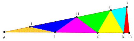 Quesito n° 9: Come si può dividere il triangolo in figura in cinque triangoli con una spezzata a zig-zag in modo che i rapporti tra le loro aree siano 1:2:3:4:5?