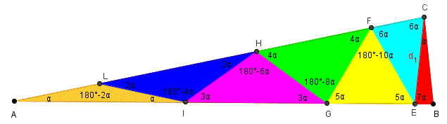 angoli alla base del triangolo GFH saranno 4α e l'angolo al vertice (180° − 8α). Quindi, l'ampiezza degli angoli alla base del triangolo