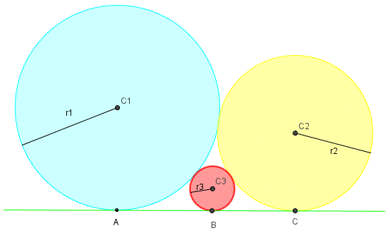 Quesito n° 2: Tre circonferenze di raggio r1, r2, r3 (con r1 > r2 > r3) sono tangenti a una retta orizzontale e ciascuna di essa è tangente alle altre due come si vede in figura. Che relazione c'è fra le misure dei loro tre raggi?