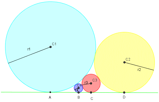 Quesito n° 3: Quattro circonferenze di raggio r1, r2, r3, r4 (con r1 > r2 > r3 > r4) sono tangenti a una retta orizzontale e ciascuna di essa è tangente a due circonferenze come si vede in figura. Che relazione c'è fra le misure dei loro raggi?