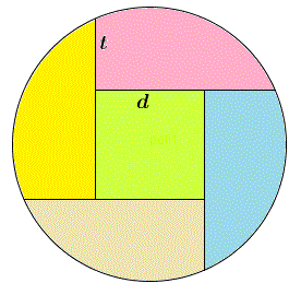 Quesito n° 39: In un cerchio di raggio r sono tracciate quattro segmenti di lunghezza t in modo da dividerlo in cinque parti di uguale area e una di queste parti è un quadrato di lato d come si vede in figura. Trova t in funzione di r.