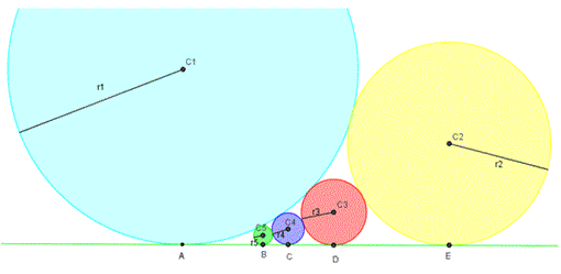 Quesito n° 4: Cinque circonferenze di raggio r1, r2, r3, r4, r5 (con r1 > r2 > r3 > r4 > r5) sono tangenti a una retta orizzontale e ciascuna di essa è tangente a due circonferenze come si vede in figura. Che relazione c'è fra le misure dei loro raggi? E se le circonferenze sono n che relazione c'è fra le misure dei loro raggi?