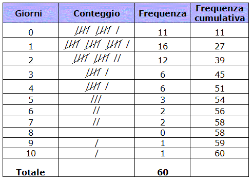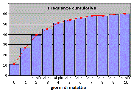 detta distribuzione di frequenze relativa ai giorni di malattia. Come si vede, nella tabella il numero delle assenze per malattia è in ordine crescente e viene riportata non solo la frequenza di ciascun dato ma anche la frequenza cumulativa che si ottiene sommando una data frequenza con le frequenze che le stanno al di sopra. E' chiaro qual è il significato della frequenza cumulativa; se ad esempio vogliamo sapere quanti sono gli operai che hanno fatto al massimo 5 giorni di malattia, basta guardare la frequenza cumulativa relativa a 5. Per studiare i dati è anche utile determinare la frequenza percentuale che si ottiene moltiplicando per 100 il rapporto tra la frequenza e il numero totale dei dati. Ad esempio, poichè gli operai che hanno fatto al massimo 5 giorni di malattia sono 54 su 60, si può dire che la loro percentuale è: