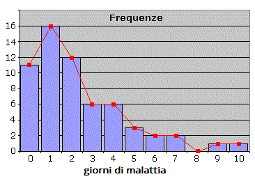 Se osserviamo questi dati grezzi, cosí come sono proposti, è difficile ricavarne qualche indicazione significativa. Non è ad esempio immediato sapere quanti sono gli operai che hanno fatto più di 3 giorni di malattia o più di 6 giorni di matattia. Dovremmo, ogni volta, esaminare l'intera massa di dati. E, ancor di più, non è affatto chiaro quale sia il numero dei giorni di malattia che meglio rappresenti la situazione (il numero medio dei giorni di malattia). Il problema è che qui abbiamo una serie di dati privi di qualsiasi organizzazione; i dati si trovano nella stessa forma in cui sono stati rilevati e non hanno subito alcun processo di elaborazione. Una prima forma di elaborazione dei dati consiste nel raggrupparli secondo un qualche criterio e stabilire quanti dati ci sono in ogni raggruppamento che chiameremo frequenza assoluta o più semplicemente frequenza. Ad esempio, riferendoci ai nostri dati, la frequenza del dato 5 è 3 perch è il dato 5 compare 3 volte nel nostro elenco (ci sono quindi 3 operai che hanno fatto 5 assenze per malattia). Raggruppiamo i dati tenendo conto della loro frequenza; poichè il massimo numero di giorni di malattia è 10, costruiamo una tabella di questo tipo: