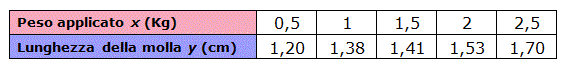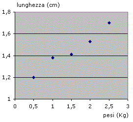 della lunghezza della molla. Ecco dunque le nostre due serie di dati correlati: i dati x (pesi) e i dati y (lunghezze). Tra le due serie di dati o, se vuoi, tra le due variabili x e y, c'è una correlazione che chiameremo positiva perchè al crescere di x cresce anche y. Quella che segue è una tabella di dati ricavati sperimentalmente: