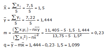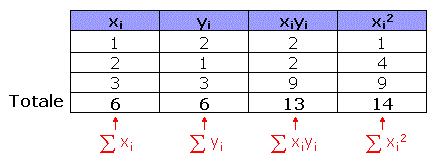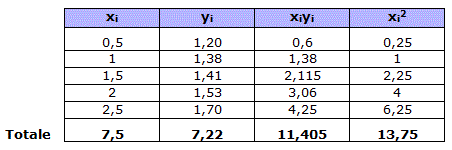 Stabilito le relazioni che ci permettono di determinare la retta di regressione ritorniamo al nostro caso iniziale dei vari pesi applicati a una molla e costruiamo la tabella in cui sono presenti i valori xi, yi, xiyi e xi2 con i che va da 1 a 5.