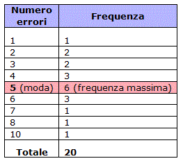 L'indice più semplice che si può usare per rappresentare questi dati è la moda cioè il valore, in una serie di dati, che ha frequenza massima. Nel nostro caso il dato che si ripete più volte è 5, ecco infatti la tabella delle frequenze: