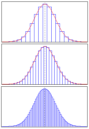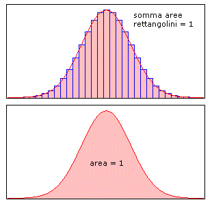 Questi istogrammi sono perfettamente simmetrici rispetto al'asse centrale (tratteggiato) e tali che l'altezza dei rettangolini simmetrici rispetto a quello centrale decresca rapidamente quando ci si allontana, a sinistra o a destra, dal rettangolo centrale. Un istogramma di questo tipo caratterizza una distribuzione di dati fondamentale in statistica che prende il nome di distribuzione normale. L'esperienza insegna che quando si ha a che fare con una gran massa di dati statistici la loro distribuzione è spesso di tipo normale; un caso tipico è quello delle altezze (o dei pesi) di una popolazione omogenea di individui. Ci sono individui più o meno alti o più o meno bassi ma è un fatto che se consideriao altezze via via minori o via via maggiori della media, troviamo un numero di individui che va decrescendo (e decresce tanto più rapidamente quanto più ci allontaniamo dalla media). Se in una distribuzione normale viene tracciato il poligono delle frequenze (ricordiamo che è la spezzata che si ottiene collegando con segmenti i punti medi della basi superiori dei rettangolini) viene ad approssimarsi una curva che ha una tipica forma a campana. La curva verrà a delinearsi in modo tanto più preciso quanto più alto è il numero dei rettangolini cioè quanto più alto è il numero delle classi di dati. Se il numero dei rettangolini tendesse all'infinito se, cioè, le classi di dati variassero con continuità, il poligono delle frequenze sarebbe proprio una bella curva a campana. Questa curva ha un nome, si chiama curva di Gauss o, semplicemente, gaussiana e ha una proprietà fondamentale: l'area compresa tra la curva e l'asse orizzontale è uguale a 1 se l'area di ciascun rettangolo è uguale alla frequenza relativa.