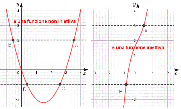 Dal punto di vista grafico se una funzione è iniettiva ogni retta orizzontale non può avere piò di un punto d'intersezione con il grafico della funzione.