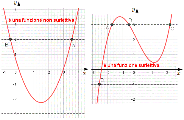 Dal punto di vista grafico se una funzione è suriettiva ogni retta orizzontale deve intersecare il grafico della funzione in almeno un punto.