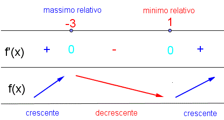 In un intorno sinistro di x=-3 è f'(x)>0 (la curva è crescente) e in un intorno destro di x=-3 è f'(x)<0 (la curva è decrescente) ciò significa che il grafico della funzione ha in x=-3 un punto di massimo relativo. In un intorno sinistro di x=1 è f'(x)<0 (la curva è decrescente) e in un intorno destro di x=1 è f'(x)>0 (la curva è crescente) ciò significa che il grafico della funzione ha in x=1 un punto di minimo relativo.